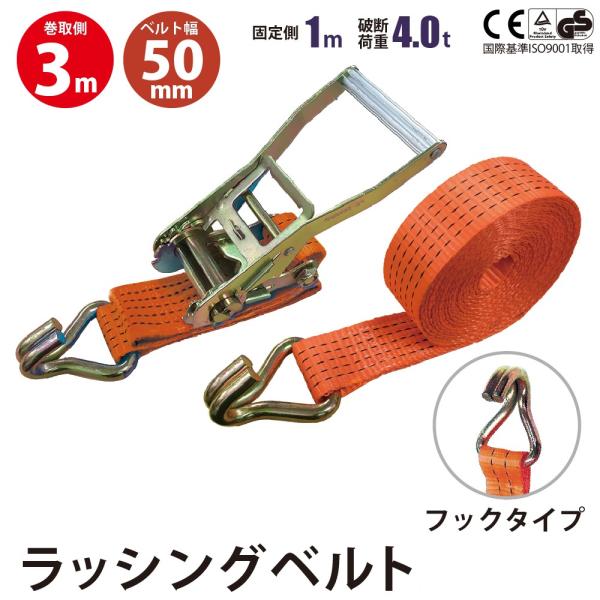 ガチャガチャ ラチェット式 ラッシングベルト Jフック 幅50mm 固定側1m 巻側3m バックル式 工具 作業 rb-f-3m