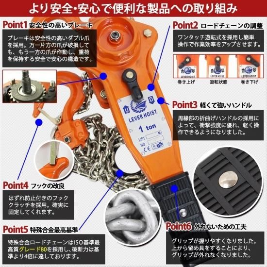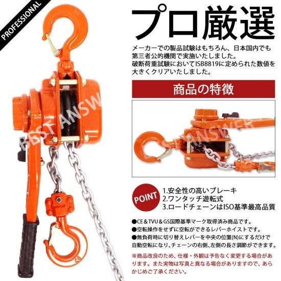 2台セットでお得です。 ■商品名:レバーホイスト 1t 1000kg 運送業の荷締め、設備機械のメンテナンス、建設業界、ロープの緊張、機械・装置の固定、アウトドア、災害復旧など多くの場面で活躍しています。 ■商品説明 メーカーでの製品試験はもちろん、日本国内でも第三者公的機関で実施致しました。破断荷重試験においてJISB8819に定められた数値を大きくクリアいたしました。 国際標準化機構ISO9001:2008認証工場で生産された国際基準CE&TVU&GS規格製品です。 早戻しが簡単。作業効率も一段とアップ。無負荷時に切り替えレバーを中央の位置(N)にするだけで自動空転になり、チェーンの右側、左側の長さ調節ができます。2本のチェーンを握って、ハンドホイルを回すだけ。よりスムーズで高効率操作性を実現、プロの現場をパワフル&スピーディーにサポートします。 雨や荷重衝撃などあらゆるショックに強い耐久性の特殊鋼ロードチェーンも装備しております。 ■商品仕様 定格荷重(t):1.0 標準揚程(m):1.5 フック間最小距離(mm):325 レバー長さ(mm):330 自動空転式 手動力(N):140 チェン線径(mm):6.0 本体重量(kg):7.2 PL保険(生産物賠償責任保険)加入商品 生産国:中国 保証:購入日より半年間 ■レバーホイストの豆知識 レバーホイスト:手動でレバーを操作することで、重たい荷物を持ち上げたり、降ろしたり、けん引したりすることが出来る製品です。 レバーブロック:レバーブロックは株式会社キトーの登録商標です。レバーホイストと同様に、手動でレバーを操作することで重たい荷物や機械などのけん引作業で活躍します。 ヒッパラー: ヒッパラーは株式会社ヒッパラーの登録商標です。レバーホイストと同様に、手動でレバーを操作することで重たい荷物や機械などのけん引作業で活躍します。 チェーンブロック:手動でチェーンを引っ張ることで歯車が回転し、小さな力で重たい物を持ち上げたり、降ろしたりすることが出来ます。 ベストアンサーのレバーホイストは巻き上げ・緩め・フリーの3段階切り替えでチェーンの長さ調整が簡単に行えます。 全国の板金業、運送業や建築業のお客さまにご利用して頂いており、更にブレーキシステム、制動パーツ、フックを最新改良版にバージョンアップし、低価格で提供しております。 ※ご使用の前に付属の取扱説明書を熟読し、機器の知識・安全の情報そして注意事項について習熟してから正しくご使用ください。 ※商品改良のため、仕様・外観は予告なく変更する場合があります。 また実物は写真と異なる場合がありますので、あらかじめご了承ください。 また多少の塗装はげ、小キズ・ヘコミ等ある場合がございますがご理解の上ご購入をお願いします。 分解・改造した場合は保証期間内であっても保証対象外とさせて頂きます。 |