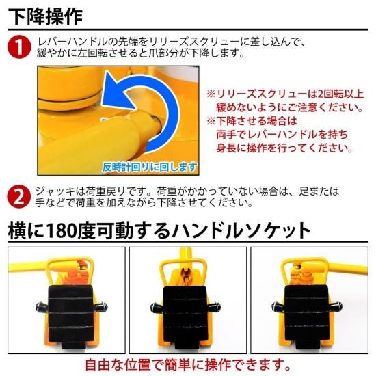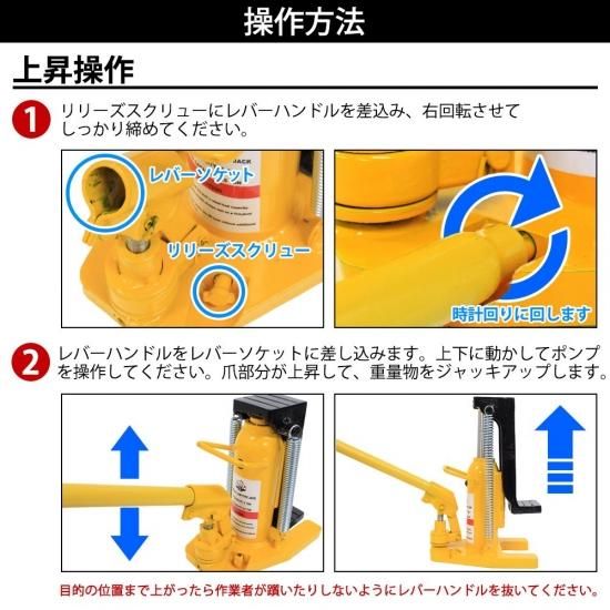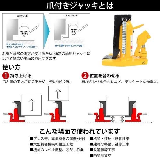 ■ジャッキ 爪つきジャッキ 爪部5t ヘッド部10t 国際基準CE規格製品格安特価 【用途】 ●重量機械の運搬、精密機械の組み立て、機械のレベル調整、建物の補修工事、防災用資材、車のタイヤ、ホイルなどの交換 ●爪位置が低くわずかなすきまで使えます。爪部と頭部の両方が使えます。 ●荷物の持ち上げ、移動、位置あわせなどに役に立ちます。 【商品説明】 ●安全荷重:爪部 5t / ヘッド部 10t ●重量:24kg ●最低位:20mm ●上げ幅:148mm ●本体サイズ:260×200×283mm ●手動油圧式 ●PL(生産物弁償責任)保険加入商品 ●生産国:中国 【注意事項】 ●絶対にジャッキの使用荷重を超えた荷物を持ち上げないでください。 ●ジャッキの底面は、常に固い、水平な平面の上に置いてご使用ください。 ●作業中に手や足などを持ち上げた荷物の下に入れないようにしてください。 ●ジャッキアップするときは必ず背板にあたるように、爪の奥まで差し込んでください。爪の先端でのジャッキアップは大変危険なので、しないでください。 ■ベストアンサーへようこそ!当店は道具・工具、カー用品からペット用品まで販売しております。5400円以上で送料無料!