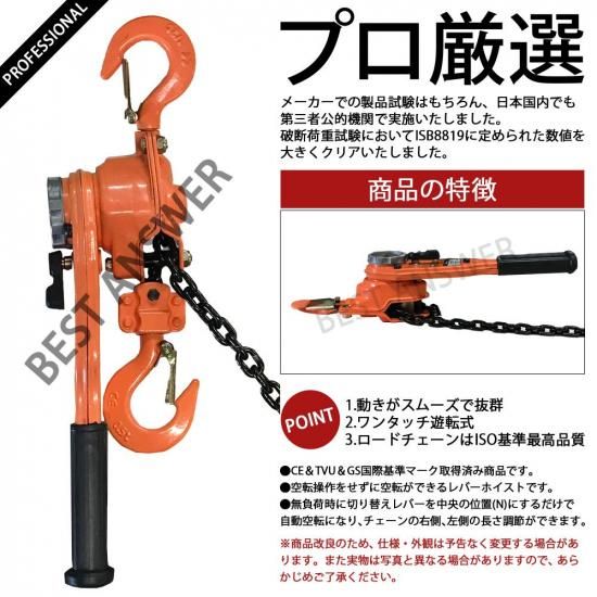 4台セットでお買い得です。 商品紹介: ●CE&TVU&GS国際基準マーク取得済み高品質です。 ●空転操作をせずに空転ができるレバーホイストです。 ●無負荷時に切り替えレバーを中央の位置(N)にするだけで自動空転になり、チェーンの右側、左側の長さ調節ができます。 商品仕様: ●定格荷重(t):0.50 ●標準揚程(m):1.5 ●フック間最小距離(mm):260 ●レバー長さ(mm):267 ●自動空転式 ●手動力(N):333 ●チェン線径(mm):5.0 ●本体重量(kg):3.5 ●PL(生産物賠償責任保険)保険加入商品 ●生産国:中国 ●保証期間:6か月 ※ご使用の前に付属の取り扱い説明書を熟読し、