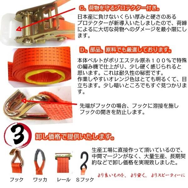 ■ラッシングベルト Jフックラッシングベルト ベルト幅50mm 固定側0.5m 巻側10m 荷締機 トラック用 ●ベルトは高強度のポリエステル原糸を使用し、耐久性は抜群です。 ●あらゆる荷物の固定・荷崩れ防止に 使用する、素早く楽々がっちりと固定します。 ●ラチェットハンドルをガチャガチャと上下操作することにより、簡単に荷締めをすることが可能。 使用範囲: 運送、運搬、倉庫、港湾作業、 林業、造園、漁業、工場などに使用されています。 例えば ●パレット積み、段ボール・樹脂製品等の荷崩れ防止 ●サーフボード・モーター ボート・オートバイなどの荷締め ●材木・ビニールパイプ等の安全集積 ●木工用の接着・修繕のためのクランプ ●倉庫内保管荷物の耐震用 ●国際標準化機構ISO9001:2008認証工場で生産CE,TUV,GS規格高品質輸入直販品です。 ●日本国内第三者公的機関試験済み、安全安心な製品です。 ●荷物をキズから守るためにスリーブを2本装備しています。 ●プロテクター付き。 ■ベストアンサーへようこそ!当店は道具・工具、カー用品からペット用品まで販売しております。5400円以上で送料無料!