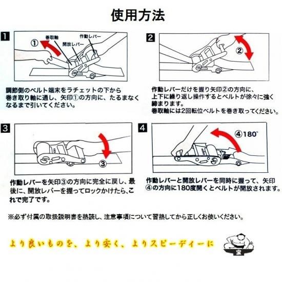 ●国際標準化機構ISO9001:2008認証工場で生産されたCE,TUV,GS規格高品質輸入直販品です。 ●日本国内第三者公的機関試験済み、安全安心な製品です。 ●荷物をキズから守るためにスリーブを2個装備しています。 ●プロテクター付 ●本体固定側ベルト長さ(m): 0.5 ●巻側長さ(m):10 ●破断荷重(kg):4000 ●材質(ベルト): ポリエステル原糸100% ●PL(生産物弁償責任)保険加入商品 ●生産国:中国 選ぶなら信頼のベストアンサーのラッシングベルト ●どんな荷締めも操作は簡単。だれでも素早く作業ができます。 ●ラチェットバックルにより、ちいさな力で大きな締め付け力が得られます。 ●あらゆる荷物もタイプを選ばずしっかりとホールドします。 ●幅の広いベルトで、荷物を損傷することなく安定した荷締めができます。 ●ベルトは高強度のポリエステル原糸100%を使用し、耐久性は抜群です。 |