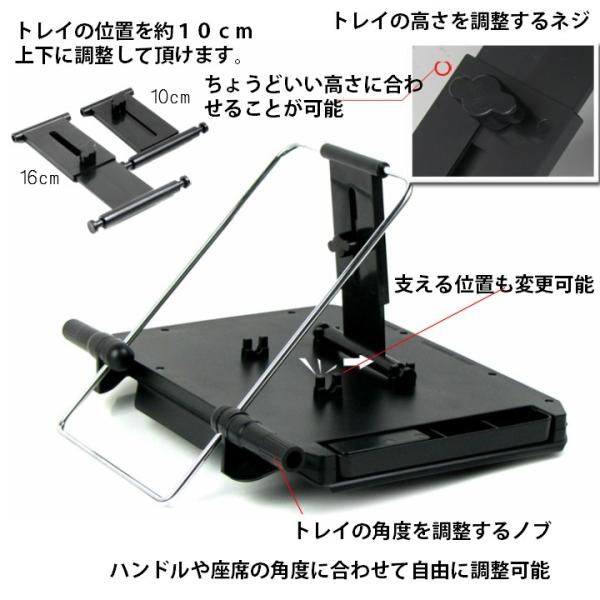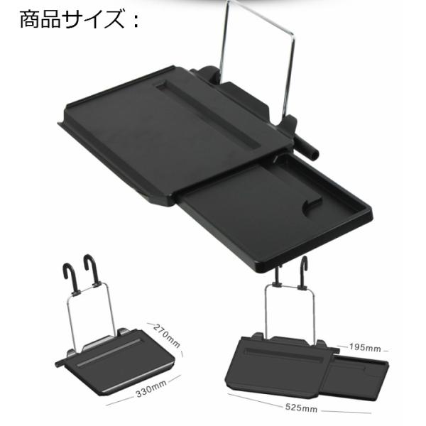 ※お車の中でのメモや書き物時、お食事に!休憩時にジュースやお菓子など置くのも良し! ※運転席のハンドルに引っ掛けることもできますが、後部座席でも使用出来ます。 ※自由に高さ、角度調整が出来るので、自分に合った位置で快適使用、折りたたみ式で必要な時に出し、使用しないときは畳んで収納。収納時はコンパクトで、全然邪魔になりません。 ※サイズ(約):330*270*25mm ※カラー:ブラック ※材質:ABS ※商品重さ:1220g ※耐荷重:約6kg ※車内でゆったり食事をとる事が出来大活躍テーブル。 ※とても軽く、サッと出して、サッとしまえて、収納にも困りません。 |