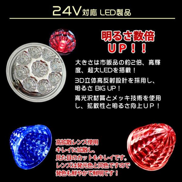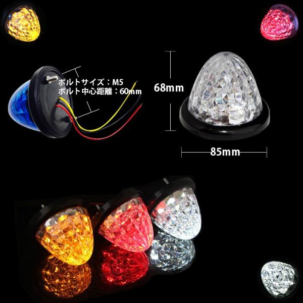 ■2個セット色選択 トラックマーカー ダイヤモンドカットレンズ リフレクター搭載 サイドマーカーに トラックマーカー バスマーカー 排気ブレーキ灯 送料無料 販売単位:2個セット カラー:白/青/赤/黄/緑/レインボー レンズ:ダイヤモンドカットレンズ 電圧:24V仕様 サイズ:高さ85mm×下部直径90mm ご注意: ※出荷前に検品はしておりますが、取付作業の前に点灯確認を行ってください。 ※完全防水では御座いませんので、必要に応じ防水処理を施してください。 ※LED球の交換はできません。 ※知識、技術に不安な方は専門業者様へ取付依頼をして下さい。 ※保証の範囲は商品のみの保証となります。それ以外、整備工場などで取り付けをした取付工賃などは保証の範囲外となります。 ※お取付の際に基盤ショート・破損などの、過失損害などは保証対象外となります。 ※設置や取り外しなどにかかる費用は、当店では一切負担できませんので、ご了承ください。 ■ベストアンサーへようこそ!当店は道具・工具、カー用品からペット用品まで販売しております。5400円以上で送料無料!