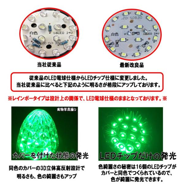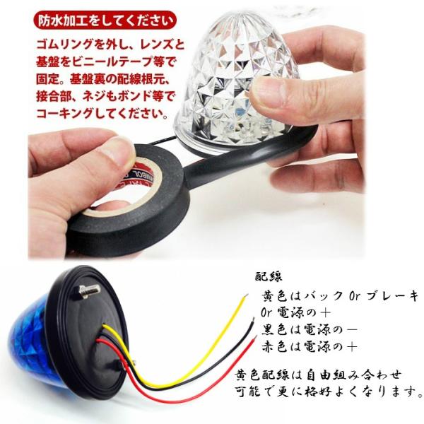 各色2個ずつ選択するできます。 カラー:白/青/赤/黄/緑/レインボー レンズ:ダイヤモンドカットレンズ 電圧:24V仕様 サイズ:高さ85mm×下部直径90mm ご注意: ※出荷前に検品はしておりますが、取付作業の前に点灯確認を行ってください。 ※完全防水では御座いませんので、必要に応じ防水処理を施してください。 ※LED球の交換はできません。 ※知識、技術に不安な方は専門業者様へ取付依頼をして下さい。 ※保証の範囲は商品のみの保証となります。それ以外、整備工場などで取り付けをした取付工賃などは保証の範囲外となります。 ※お取付の際に基盤ショート・破損などの、過失損害などは保証対象外となります。 ※設置や取り外しなどにかかる費用は、当店では一切負担できませんので、ご了承ください。 |