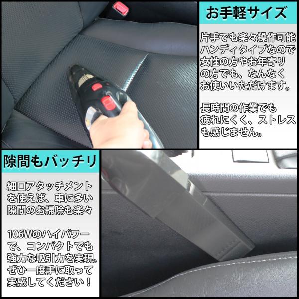 ■あすつく対応 車内の掃除に最適 騒音 塵散軽減 改良型 片手で楽々、ハンディタイプの車内用掃除機が登場。 5mの長いコードが付いているため、ほとんどのお車の 後部座席やトランクまでお掃除が可能です。 ■改良点 ・ハネの改良 内部のハネがアルミ製に変更されたことにより、 吸引力が約20%アップし、作動時の騒音は 約20%軽減されました。 ・コードの改良 コードの太さが約30%太くなりました。 これにより、長時間の使用でも熱を持ちにくくなりました。 ・ダストカップの改良 吸引時のゴミの飛散を防ぐため、カップ内部に シールドを装着しました。もちろん、これによる 吸引力の低下はありません。 ■付属品 ・クリーナー本体×1 ・電源コード(5m)×1 ・延長ホース×1 ・ブラシ付きアタッチメント×1 ・隙間用アタッチメント×1 ・HEPAフィルター×1 ・専用収納バッグ×1 ■安心の保証付き 1年間の保証付きなので安心。 期間内に破損や故障などがあれば、 無償で修理および交換対応させていただきます。 (※保証につきましては、当ショップ規約に準じます。 詳しくは、ページ下部にございます、お買い物 インフォメーションをご覧ください。)