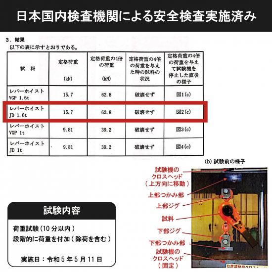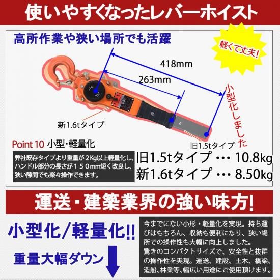 ■商品名:レバーホイスト 1.6t 1600kg ●用途: 運送業の荷締め、設備機械のメンテナンス、建設業界、 ロープの緊張、機械・装置の固定、アウトドア、災害復旧など多くの場面で 活躍しています。 商品の説明: ●メーカーでの製品試験はもちろん、日本国内でも第三者公的機関で実施致しました。破断荷重試験においてJISB8819に定められた数値を大きくクリアいたしました。 ●早戻しが簡単。作業効率も一段とアップ。無負荷時に切り替えレバーを中央の位置(N)にするだけで自動空転になり、チェーンの右側、左側の長さ調節ができます。 2本のチェーンを握って、ハンドホイルを回すだけ。よりスムーズで高効率操作性を実現、プロの現場をパワフル&スピーディーにサポートします。 ● 雨や荷重衝撃などあらゆるショックに強い耐久性の特殊鋼ロードチェーンも装備しております。 商品の仕様 ●定格荷重(t):1.6 ●標準揚程(m):1.5 ●フック間最小距離(mm):350 ●レバー長さ(mm):265 ●自動空転式 ●手動力(N):365 ●チェン線径(mm):7.1×19.9 ●本体重量(kg):8 ●PL保険(生産物賠償責任保険)加入商品 生産国:中国 保証:購入日より半年間 ■レバーホイストの豆知識 レバーホイスト:手動でレバーを操作することで、重たい荷物を持ち上げたり、降ろしたり、けん引したりすることが出来る製品です。 レバーブロック:レバーブロックは株式会社キトーの登録商標です。レバーホイストと同様に、手動でレバーを操作することで重たい荷物や機械などのけん引作業で活躍します。 ヒッパラー: ヒッパラーは株式会社ヒッパラーの登録商標です。レバーホイストと同様に、手動でレバーを操作することで重たい荷物や機械などのけん引作業で活躍します。 チェーンブロック:手動でチェーンを引っ張ることで歯車が回転し、小さな力で重たい物を持ち上げたり、降ろしたりすることが出来ます。 ベストアンサーのレバーホイストは巻き上げ・緩め・フリーの3段階切り替えでチェーンの長さ調整が簡単に行えます。 全国の板金業、運送業や建築業のお客さまにご利用して頂いており、更にブレーキシステム、制動パーツ、フックを最新改良版にバージョンアップし、低価格で提供しております。 ※ご使用の前に付属の取扱説明書を熟読し、機器の知識・安全の情報そして注意事項について習熟してから正しくご使用ください。 ※商品改良のため、仕様・外観は予告なく変更する場合があります。 また実物は写真と異なる場合がありますので、あらかじめご了承ください。 また多少の塗装はげ、小キズ・ヘコミ等ある場合がございますがご理解の上ご購入をお願いします。 分解・改造した場合は保証期間内であっても保証対象外とさせて頂きます。 ■検索キーワード 1.5 1.5t 1.5トン 1500kg 1500キロ |
