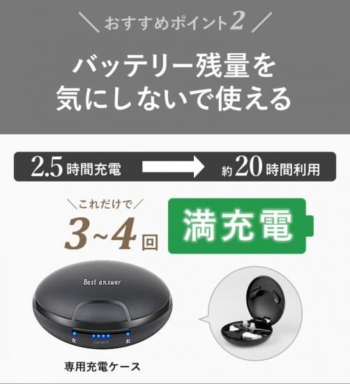 外出中、旅行中、出張中も安心の専用充電ケースが付属しています。充電の仕方も集音器をケースに収納するだけ。電池切れを気にせず、どこにでも持ち歩いて安心してお使いいただけます。1回の充電はわずか2.5時間。充電式の為、電池替えも必要ありません。