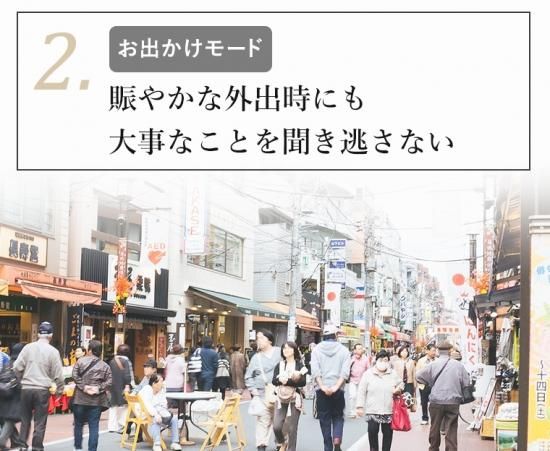 外出時に周りが騒がしい時に雑踏の音は押さえて、人の声は聞き取りやすくします。