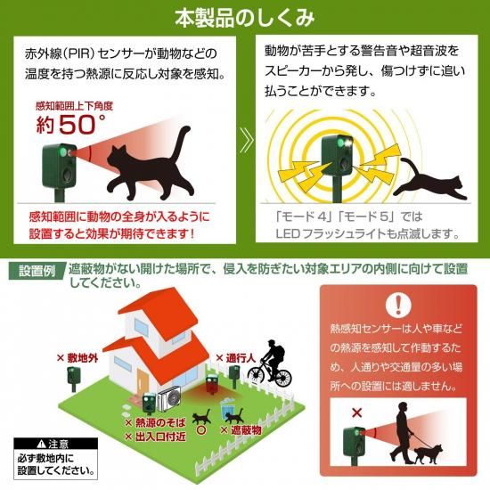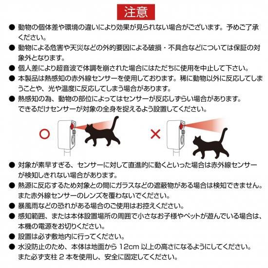 動物撃退 害獣撃退 害鳥撃退 害獣対策 害鳥対策 猫撃退 猫対策 ネコ撃退 ネコ対策 野良猫 対策 撃退 避け よけ 除け 野良猫撃退 ねこよけ 猪 イノシシ 猿 サル 鼠 ネズミ 犬 イヌ 狐 キツネ 蝙蝠 コウモリ 鼬 イタチ アライグマ 鳩 ハト 烏 カラス 鹿 シカ 猫よけグッズ 猫避けグッズ