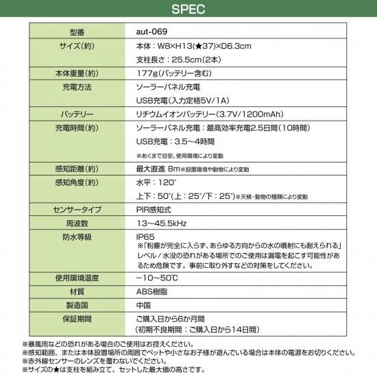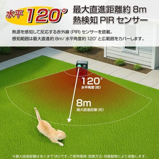 ※本製品は熱感知の赤外線センサーを使用しております。稀に動物以外に反応してしまうことや、