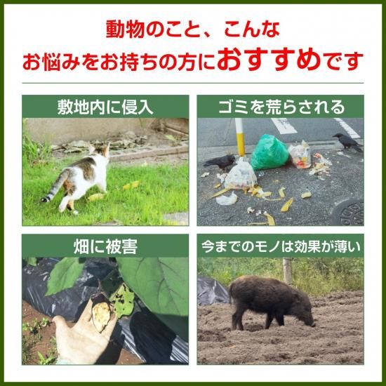 動物撃退 害獣撃退 害鳥撃退 害獣対策 害鳥対策 猫撃退 猫対策 ネコ撃退 ネコ対策 野良猫 対策 撃退 避け よけ 除け 野良猫撃退 ねこよけ 猪 イノシシ 猿 サル 鼠 ネズミ 犬 イヌ 狐 キツネ 蝙蝠 コウモリ 鼬 イタチ アライグマ 鳩 ハト 烏 カラス 鹿 シカ 猫よけグッズ 猫避けグッズ